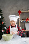 Uroczy chłopiec patrząc na ciebie i wyciągając rękę do ciasta podczas pochylania się nad drewnianym stołem przed jego mama gotowania