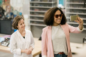 Szczęśliwy mieszane wyścig dziewczyna w smart casual podejmowania selfie podczas przymierzania nowego okularu w sklepie optycznym