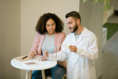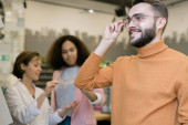 Pewny siebie konsultant w białym płaszczu stojący na wystawie z nową kolekcją okularów i pokazujący je młodej parze