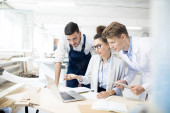 Zdjęcie "Pewny siebie konsultant w białym płaszczu stojący na wystawie z nową kolekcją okularów i pokazujący je młodej parze" może być wykorzystywane do celów osobistych i komercyjnych zgodnie z warunkami zakupionej licencji Royalty-free. Obraz jest dostępny do pobrania w jakości wysokiej rozdzielczości do 5760x3840.