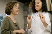 Zdjęcie "Pretty młoda uśmiechnięta brunetka kobieta przymierza nowe okulary przed lustrem na tle wyświetlacza z okularem" może być wykorzystywane do celów osobistych i komercyjnych zgodnie z warunkami zakupionej licencji Royalty-free. Obraz jest dostępny do pobrania w jakości wysokiej rozdzielczości do 5760x3840.
