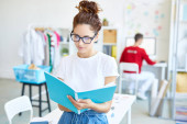 Pretty młoda uśmiechnięta brunetka kobieta przymierza nowe okulary przed lustrem na tle wyświetlacza z okularem