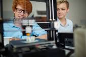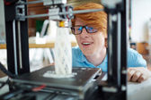 Młody technik ze śrubokrętem naprawiającym głowicę drukującą lub mocującym jeden z paneli drukarki 3D w biurze