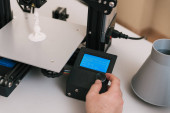 Zdjęcie "Dłoń młodego projektanta naciśnięcie przycisku startu na panelu sterowania drukarki 3D przed rozpoczęciem procesu pracy" może być wykorzystywane do celów osobistych i komercyjnych zgodnie z warunkami zakupionej licencji Royalty-free. Obraz jest dostępny do pobrania w jakości wysokiej rozdzielczości do 5760x3840.
