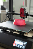 Dłonie młodego inżyniera lub projektanta trzymającego figurę geometryczną nad drewnianym stołem, siedzącego przed laptopem