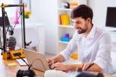Poważny człowiek koncentrujący się na pracy nad nowymi obiektami na tle swojego kolegi sprawdzającego szpulę na drukarce 3D