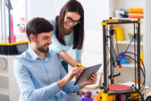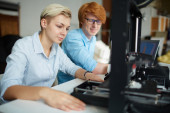 Młody inżynier wskazujący na wyświetlacz laptopa podczas dyskusji o prezentacji nowych drukowanych elementów 3D z kolegą na spotkaniu