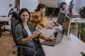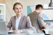 Zdjęcie "Ładny młody menadżer patrząc na ciebie z zębaty uśmiech siedząc w miejscu pracy przed laptopem ze współpracownikiem na tle" może być wykorzystywane do celów osobistych i komercyjnych zgodnie z warunkami zakupionej licencji Royalty-free. Obraz jest dostępny do pobrania w jakości wysokiej rozdzielczości do 5760x3840.