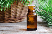 Mała butelka z olejkiem z jodły i gałązek jodły. Świąteczna aromaterapia. Zimowe spa i ziołowe składniki medycyny. Przestrzeń kopiowania