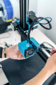 Jeden z młodych menedżerów wciskający przycisk na panelu sterowania drukarki 3d podczas drukowania różowego obiektu