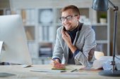 Młody biznesmen z touchpadem stojący przed kamerą na tle kolegi pracującego z drukarką 3D