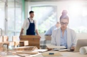 Ładna młoda bizneswoman patrząc na wyświetlaczu laptopa podczas pracy z elektronicznych szkiców figur geometrycznych przed drukowaniem