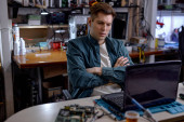 Zdjęcie "Młody mistrz w stroju casualwear trzymający jeden z zepsutych gadżetów stojąc w miejscu pracy przed kamerą" może być wykorzystywane do celów osobistych i komercyjnych zgodnie z warunkami zakupionej licencji Royalty-free. Obraz jest dostępny do pobrania w jakości wysokiej rozdzielczości do 5760x3840.