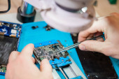 Szczypce w rękach profesjonalnego mechanika podczas pracy z drobnymi szczegółami zepsutego smartfona