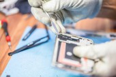 Przegląd rąk mechanika w rękawicach ochronnych przy użyciu sprzętu do naprawy gadżetów podczas badania uszkodzonego smartfona