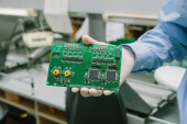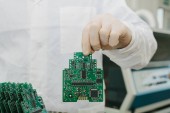 Ręce rękawiczki mistrza serwisu naprawy trzymając część zdemontowanego gadżetu podczas badania go i próbując dowiedzieć się przyczyny złamania