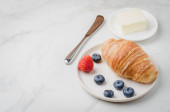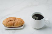 Francuskie śniadanie. Biały kubek z czarną kawą i rogalikiem z