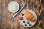 filiżanka kawy, rogalik z jagodami w białej misce i masło na w