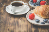 filiżanka kawy, rogalik z jagodami w białej misce i masło na w