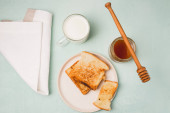 Croissant i nóż z masłem na ciemnym kamiennym tle. Do