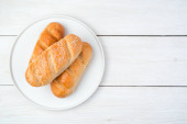 Croissant i nóż z masłem na drewnianym stole. Brea francuska