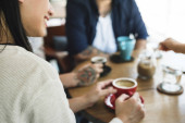 Dłonie kolegów z koledżu zebrane przy stole w kawiarni po zajęciach, po cappuccino i konsultacji w sprawie pracy domowej