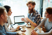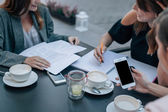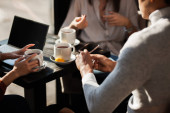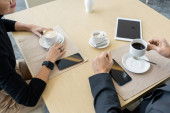 Dłonie kolegów z koledżu z gadżetami i napojami zgromadzonymi przy stole w kawiarni po zajęciach, po cappuccino i czacie