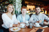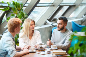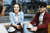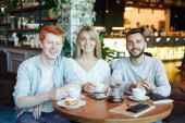 Happy casual facet z filiżanką cappuccino i jego dziewczyna patrząc na ich przyjaciela podczas rozmowy przy stole w kawiarni