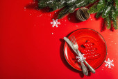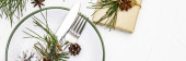Ustawienie świątecznego i noworocznego obiadu. Gałąź jodły, świece, szyszki, ceramiczne talerze, widelec i nóż. Sztućce zimowe drewniane tło