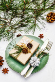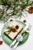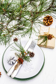 Ustawienie świątecznego i noworocznego obiadu. Gałąź jodły, świece, szyszki, ceramiczne talerze, widelec i nóż. Sztućce zimowe drewniane tło