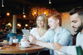 Młody student w stroju casualwear siedzi przy stole w kawiarni przed laptopem i networking na tle swoich przyjaciół za pomocą touchpad