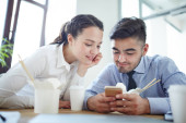 Całkiem poważna blondynka i jej chłopak siedzą przy stole w kawiarni, pijąc drinki i korzystając z mobilnych gadżetów w wolnym czasie