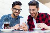 Dwóch szczęśliwych facetów z mobilnymi gadżetami oglądających ciekawe rzeczy w smartfonie jednego z nich podczas spędzania czasu w kawiarni