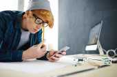 Zdjęcie "Dwóch szczęśliwych facetów z mobilnymi gadżetami oglądających ciekawe rzeczy w smartfonie jednego z nich podczas spędzania czasu w kawiarni" może być wykorzystywane do celów osobistych i komercyjnych zgodnie z warunkami zakupionej licencji Royalty-free. Obraz jest dostępny do pobrania w jakości wysokiej rozdzielczości do 5760x3840.