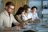 Zdjęcie "Dwóch mądrych facetów za pomocą gadżetów, podczas gdy blondynka robi notatki w notatniku przy stole w kawiarni po zajęciach" może być wykorzystywane do celów osobistych i komercyjnych zgodnie z warunkami zakupionej licencji Royalty-free. Obraz jest dostępny do pobrania w jakości wysokiej rozdzielczości do 5760x3840.