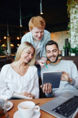 Szczęśliwi koledzy patrząc na touchpad wyświetlacz organizowany przez jednego z chłopaków podczas przygotowań do seminarium lub projektu w kawiarni uczelni