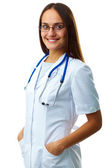 młody uśmiechnięty brunetka klinicysta w biały płaszcz trzymając jej ręce w kieszeniach podczas stojąc przed aparatem w izolacji