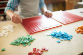 Zdjęcie "Młoda kobieta tnąca przezroczystą masę mydła na pokładzie wśród form silikonowych, olejków eterycznych i innych składników aromatycznych" może być wykorzystywane do celów osobistych i komercyjnych zgodnie z warunkami zakupionej licencji Royalty-free. Obraz jest dostępny do pobrania w jakości wysokiej rozdzielczości do 5760x3840.