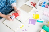 Młoda kobieta tnąca przezroczystą masę mydła na pokładzie wśród form silikonowych, olejków eterycznych i innych składników aromatycznych