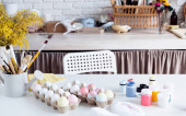 Młoda kobieta trzyma nóż nad kryształami twardej masy mydła podczas cięcia go na pokładzie wśród składników aromatycznych