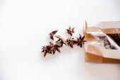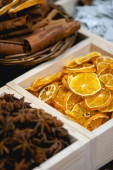 Świeże plasterki pomarańczy, paluszki cynamonowe i tarte suche przyprawy w płynnej masie mydła wewnątrz plastikowego pojemnika