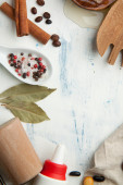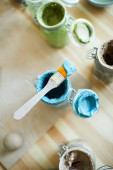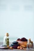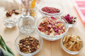 Przegląd duży biały pasek twardej masy mydlanej, miski z suchych kwiatów, małe butelki z esencji i kolorów na drewnianym stole