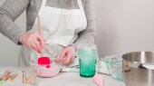 Dłonie kreatywnej dziewczyny wkładając kolor z jednej z małych plastikowych butelek do masy mydła w płynie w naczyniach szklanych