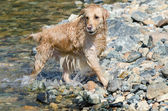 miód kolor golden retriever, który pływa, biegnie i bawi się w małym jeziorku