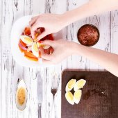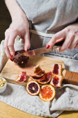 Ręce samicy z nożem tnącym duże ręcznie robione mydło z cynamonem, anyżem i pomarańczą na drewnianej desce