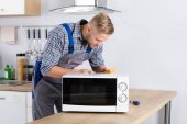 Młody mężczyzna przygotowywania żywności w kuchenka mikrofalowa na kuchennym blacie