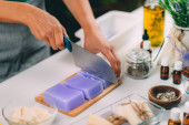 Ręce dziewczyny pakujące różowy ręcznie robiony pasek mydła do papierowego opakowania na drewnianej desce robiąc prezenty dla przyjaciół