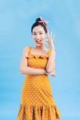 Modna, pełna wdzięku młoda kobieta pozująca na niebieskim tle. Romowie