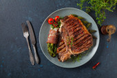 Zdjęcie "Pieczona wieprzowina z suszonymi śliwkami i orzechami sosnowymi ozdobiona trawą górską" może być wykorzystywane do celów osobistych i komercyjnych zgodnie z warunkami zakupionej licencji Royalty-free. Obraz jest dostępny do pobrania w jakości wysokiej rozdzielczości do 5760x3840.