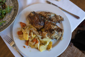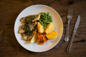 Pieczona wieprzowina z suszonymi śliwkami i orzechami sosnowymi ozdobiona trawą górską